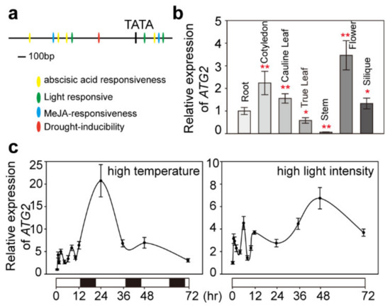 Cis-acting regulatory and expression pattern of ATG2. (a) Cis-acting regulatory elements analyzed by Plant CARE. The bar represents 100 bp of nucleic acids; (b) Expression pattern of ATG2 in various organs analyzed via quantitative RT-PCR. Values are mean ± SE. Asterisk indicates significant difference from the wild type at ** p < 0.01 (Student’s t test); (c) Expression levels of ATG2 induced by high light intensity and high temperature stresses. WT plants were grown on ½ MS medium containing 1% sucrose under normal conditions for 10 days, then exposed to high light intensity (350 μmol·m−2·s−1) or high temperature (30 °C). White bars denote lighted intervals and black bars denote darkness.