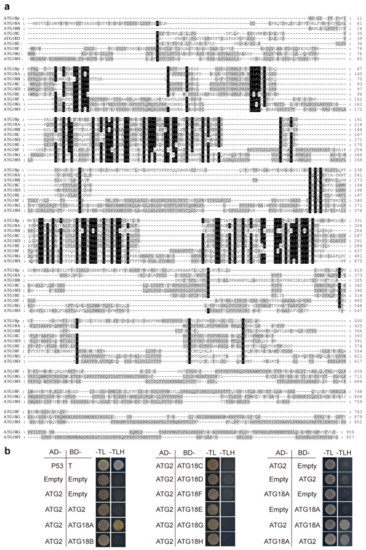 Based on phylogenetic analysis, AtATG2 was the only homolog of yeast ATG2p. In yeast, ATG2p and ATG18p interact during autophagosome formation [21]. In Arabidopsis, there are eight ATG18p homologs named ATG18A–ATG18H. ATG18A–ATG18H have one to three WD-40 repeat proteins and are expressed in various organs and tissues of plants [25]. ATG18B showed the highest similarity with ATG18p and ATG18G showed the lowest similarity based on the sequence comparisons of the full-length proteins (Figure 8a). However, there were no obvious phenotypes of atg18b mutants, during nitrogen and carbon starvation and during senescence. atg18a mutants showed early leaf senescence and were more sensitive to nutrient starvation conditions [25]. We further examined the interaction between ATG2 and ATG18A–ATG18H using yeast two-hybrid assays. ATG2 was fused with the GAL4 transcription activation domain (AD), and ATG18A–ATG18H were fused with the GAL4 DNA-binding domain (BD) and transformed into AH109. The results showed that ATG2 could interact with ATG18A but not with other ATGs in yeast. To confirm the interaction, ATG2 was fused with BD and ATG18A with AD. The results indicated that AtATG2 interacted with ATG18A in yeast (Figure 8b).