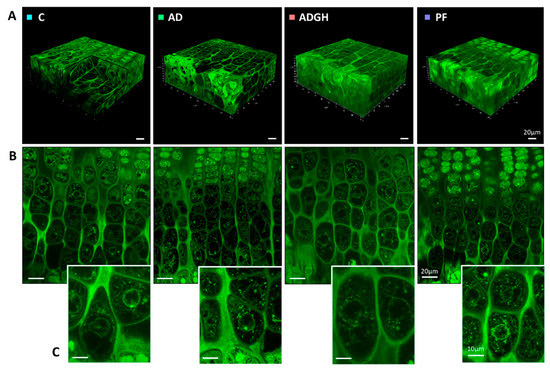Confocal imaging of the growth plate cartilage. (A) A 3D projection of the thick section of the growth plate columns. Three-dimensional visualization is shown in Supplementary Videos 1–8. (B) Optical sections of focal planes of the hypertrophic zone. (C) Detail of terminal hypertrophic chondrocytes of the growth plates of the four experimental groups. C, control rats; AD, adenine 0.5% rats; ADGH, adenine 0.5% rats treated with growth hormone; PF, pair-fed rats.