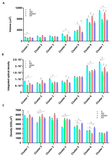 The GP of the GH group (ADGH) showed a reduced chondrocyte volume in cluster 1, but the pattern of the chondrocyte volume increase was normalized from cluster 2 to 3. Chondrocytes increased their volume in the transition from cluster 3 to 4, and by cluster 4, they paralleled their volume with that of the control and significantly increased their IOD to higher values than the AD chondrocytes. In the transition from cluster 4 to 5, GH treatment caused a large volume enlargement (×2,3) which was not proportional to the increase in the IOD (×1,3), reducing the cell cytoplasm density even more than that of the AD chondrocytes. In the transitions from cluster 5 to 6 and 6 to 7, GH chondrocytes presented a similar pattern of increase in both volume (×1,7) and IOD (×1,3) than the uremic untreated chondrocytes (Figure 2A,B). By cluster 7, GH chondrocytes had a normalized chondrocyte volume (Figure 1C and Figure 2A).