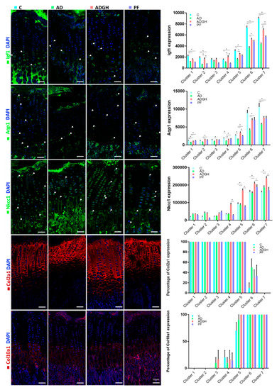 Immunohistochemical analysis of the expression of growth plate markers. Representative images are shown for Igf1 (green), Aqp1 (green), Nkcc1 (green), Col2a1 (red), and Col10a1 (red) and their corresponding quantifications in the seven described clusters. Arrowheads mark some of the labeled cells. Blue nuclei are stained by DAPI. DAPI, 4′,6-diamidino-2-phenylindole; C, control rats; AD, adenine 0.5% rats; ADGH, adenine 0.5% rats treated with GH; PF, pair-fed rats; Col2a1, collagen 2 alpha chain 1; Col10a1, collagen 10 alpha chain 1; Nkcc1, Na K Cl− cotransporter 1; Aqp1, aquaporin 1; Igf1, insulin growth factor 1. Values are mean ± SEM. * p value < 0.05.