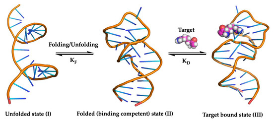 Equilibrium between the unfolded aptamer state (I) and its binding competent state (II) with corresponding equilibrium constant KF. The binding competent state (II) is able to bind the target (conformation III), which is characterized by the dissociation constant KD.