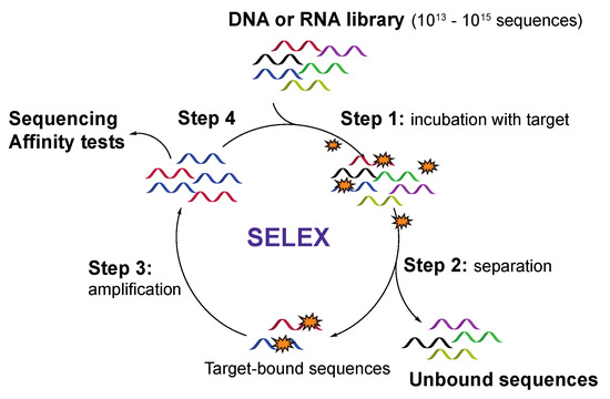 Discovery of new aptamer sequences with affinity for a target of interest is typically achieved by screening a random library of chemically synthesized oligonucleotides (1013–1015 sequences) via a process called Systematic Evolution of Ligands by Exponential Enrichment (SELEX). This method was first published in 1990 by two independent research groups for screening a library of RNA sequences [27,28] and has since rapidly evolved as the method of choice for both DNA and RNA aptamer selection. The conventional SELEX procedure (Figure 2) starts with the synthesis of a randomized library of DNA sequences, which are flanked by primer regions necessary for further amplification via the polymerase chain reaction (PCR). For the screening of RNA aptamers, the DNA library should first be converted into RNA sequences via in vitro transcription. In the next step, the target molecule is incubated with the synthetic library (step 1), after which, a first selection round can be performed (step 2). A key aspect, herein, is the efficient separation of target-bound sequences from unbound sequences followed by amplification of the former via PCR (DNA aptamers) or reverse transcription-PCR (RNA aptamers) (step 3). The enriched library pool is then used for a next screening round (step 4). This process is repeated until the initial library is reduced to a considerable number of high affinity aptamers, obtained by steadily increasing the stringency of the selection process in each cycle. After the last cycle, the enriched aptamer pool is sequenced, and additional assays can be performed to characterize the binding behavior of the aptamer to its target. In recent years, multiple adaptations to the original protocol have been described for improving the aptamer selection process and to allow the screening of modified aptamers [29,30,31,32,33].