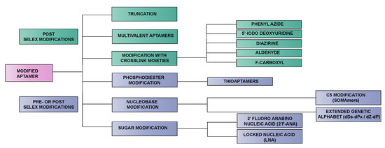 Flow diagram visualizing the aptamer modifications discussed in this review. These modifications are incorporated either via a pre- and/or post-SELEX strategy in the aptamer sequence. The modifications in the green boxes are typical post-SELEX modifications, while the modifications in the purple boxes can be introduced both before (pre) or after (post) the SELEX process.