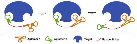 Following this concept, bivalent or multivalent aptamer constructs have been synthesized, which are composed of at least two identical or different aptamer sequences that are joined together via a covalent linker or via non-covalent interactions. By correct choice of linker type, length and flexibility, the binding strength of the multivalent aptamer can largely exceed that of the monovalent counterpart [75,76].