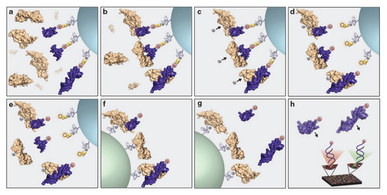 Schematic representation of the SOMAscan assay. Beige structure—protein in sample, purple structure—SOMAmer with affinity for target protein, grey circle B—biotin on streptavidin (SA)-coated bead, yellow square L—photocleavable linker, red circle F—fluorophore. In this DNA microarray platform, 5′-biotinylated SOMAmers are modified with a photocleavable linker and a fluorescent tag followed by coating on streptavidin beads. The obtained functionalized beads are incubated with the sample (e.g., blood, plasma, serum) allowing cognate and non-cognate interactions between the SOMAmers and the proteins (step a). Subsequently, unbound proteins are removed from the beads via a washing step (step b) followed by biotinylation of the bound proteins (step c). Next, the SOMAmer–protein complexes are released from the beads via UV irradiation of the photocleavable linker (step d) and non-specific interactions are disrupted using a polyanionic competitor (step e). Next, the target protein–SOMAmer complexes are recaptured on a new set of streptavidin-coated beads (step f), thereby further increasing the specificity of the process. Finally, the surface bound protein–SOMAmer complex is disrupted under denaturing conditions (step g) and the released SOMAmers are hybridized to their complementary immobilized sequences in a microarray format (step h). The subsequent fluorescent read-out gives a direct quantification of the amount of protein present in the sample as the SOMAmer forms a 1:1 complex with its target protein. Reprinted with permission from ASGCT, Mol Ther Nucleic Acids. 2014 Oct; 3(10): e201.