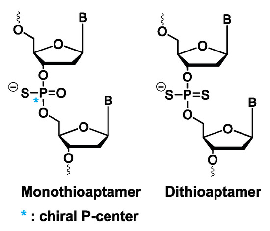 Chemical modification of aptamers can also be envisioned on the phosphodiester linkage instead of at the nucleobase level. Thioaptamers are aptamer derivatives, where one (monothio) or both (dithio) non-bridging phosphodiester oxygens are substituted with sulfur (Figure 11). In the case of monothioaptamers, a chiral center is generated on the phosphor atoms during synthesis, with concomitant formation of diastereoisomers. For dithioaptamers, the backbone phosphor atoms are achiral. Replacing one or more oxygen atoms with sulfur results in altered characteristics of thioaptamers compared to regular oligonucleotides, such as increased nuclease resistance and stronger binding towards protein targets [137]. The latter is linked to the soft anion character of sulfur (compared to the hard anion character of oxygen), which results in a less favorable soft–hard interaction between the sulfur anion and hard cationic counterions surrounding the phosphate backbone, like sodium or potassium [138]. Consequently, upon protein binding, less energy is needed to strip away these counterions from the sulfur anions compared to oxygen, which, in turn, results in the observed enhanced binding affinity of thioaptamers [21]. However, care must be taken when considering these backbone modifications, as a too high substitution ratio of oxygen atoms with sulfur results in non-specific binding interactions, hence, emphasizing the need for selection methods, where the number and position of thiosubstitutions can be controlled. For this purpose, combinatorial- [139], bead-based- [140] and high-throughput [141] selection methods have been described.