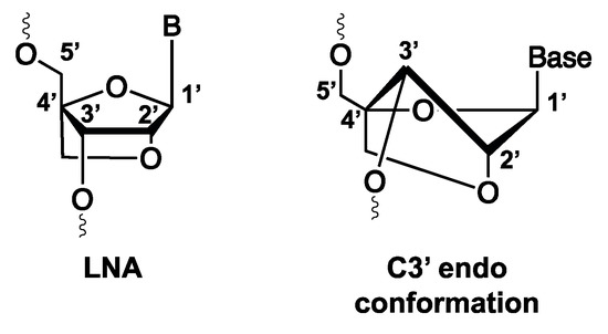 - Koshkin, A.A.; Singh, S.K.; Nielsen, P.; Rajwanshi, V.K.; Kumar, R.; Meldgaard, M.; Olsen, C.E.; Wengel, J. LNA (Locked Nucleic Acids): Synthesis of the adenine, cytosine, guanine, 5-methylcytosine, thymine and uracil bicyclonucleoside monomers, oligomerisation, and unprecedented nucleic acid recognition. Tetrahedron 1998, 54, 3607–3630. [Google Scholar] [CrossRef]