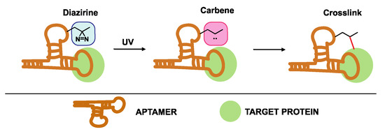 An alternative photoreactive crosslinking aptamer for efficient labeling and pull-down of unknown targets is the diazirine-modified aptamer shown in Figure 15. In 2014, Yang et al. described the synthesis of two diazirine-modified aptamers, which bind to streptavidin and thrombin [162]. First, the effect of incorporating the modified diazirine building block at different locations in the aptamers sequence was investigated. It was clear that introducing the diazirine moiety on certain positions had a major impact on target binding, thus, demonstrating the importance of fine-tuning the positioning of modifications during the aptamer optimization process. Having identified suitable diazirine-modified aptamers with retention of binding capability, both aptamers were employed for the pull-down of streptavidin and thrombin. UV irradiation of the diazirine moiety results in the formation of a reactive carbene intermediate responsible for crosslinking to the target. A high specificity and pull-down efficiency was observed for both aptamers, which highlights their potential in the identification of unknown protein targets.