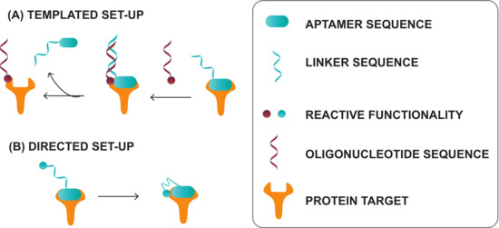 Principle of the templated directed ligation (A) and the directed non-templated ligation strategy (B). Reprinted (adapted) with permission from Chem. Sci., 2016, 7, 2157–2161—Published by the Royal Society of Chemistry. Creative Commons. License link available online: https://creativecommons.org/licenses/by/3.0/legalcode (accessed on 8 June 2020).