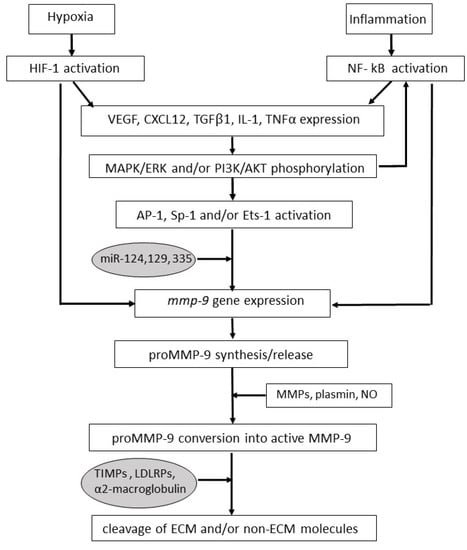 In this context, it is noteworthy that transcription factors promoting MMP-9 expression can be repressed by microRNAs, which keeps MMP-9 levels low, unless otherwise required (Figure 1) [37,38].
