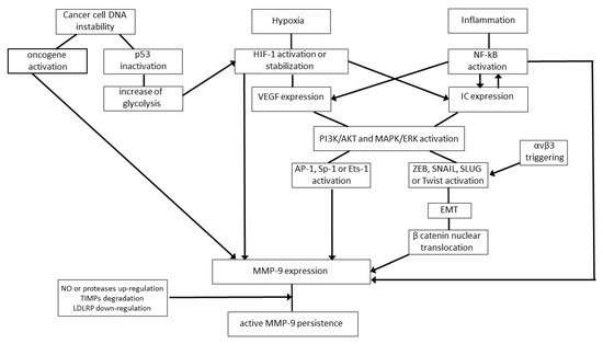 The extrinsic mechanisms leading to MMP-9 upregulation mainly refer to hypoxia or inflammation, which often coexist at the tumor site (Figure 2) [59,60]. Specifically, when the tumor increases in size, the cells placed in its core area become hypoxic, as they are far from the oxygen-supplying blood vessels [59]. Then, a biologically relevant number of hypoxic tumor cells undergo necrosis, and this sets off an inflammatory response in which leukocytes infiltrate the tumor area and produce cytokines such as tumor necrosis factor α and interleukin-1 or -6 (Figure 2) [60]. Under these conditions, intracellular signaling pathways triggering MMP-9 expression, including the phosphoinositide 3 kinase (PI3K)/protein kinase B (AKT) and the mitogen-activated protein kinases (MAPK)/extracellular-signal-regulated kinases (ERK) pathways, are strongly stimulated, as are the MMP-9 transcription factors Activator Protein-1, Specificity protein-1 or Ets-1 (Figure 2) [34,36,57,61,62]. Moreover, NF-kB is further activated by inflammatory cytokines which are its transcriptional targets, thereby promoting MMP-9 expression by both the transformed and normal cells constituting the tumor mass (Figure 2) [62].