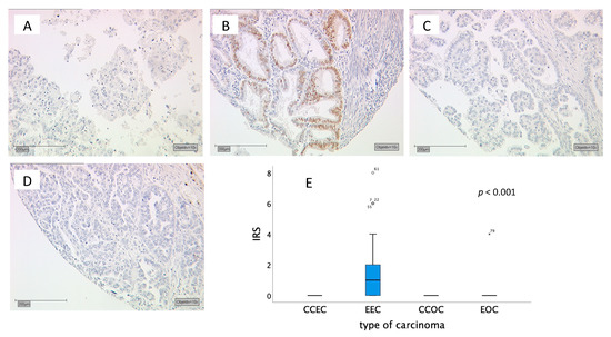 Type of carcinoma showed a median IRS of 1 in endometrioid endometrial carcinomas (with a box length of 0–2 and a 95th percentile at 4), while endometrioid ovarian carcinomas and the clear cell type carcinomas had a median IRS of 0 (p < 0.001) (Figure 1).