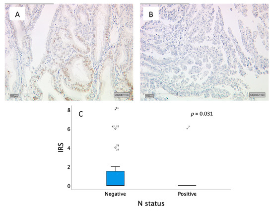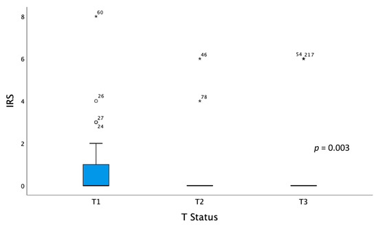 Another significant difference in the IRS score was found for the N status (lymph node staging). Those patients, who had tumor-infiltrated lymphoid nodes showed a median IRS of 0. On the other side, patients with no infiltrated lymphoid nodes had a median IRS of 0 with a box length of 0–1.5 and a 95th percentile at 2 (p = 0.031) (Figure 4).