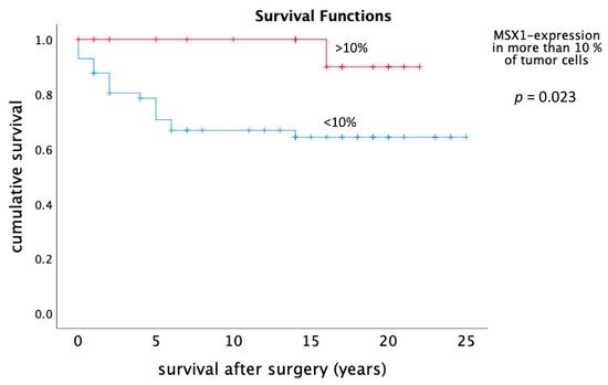 Survival of patients with MSX1-expression in more than 10% of the tumor cells and less than 10% MSX-1 expression or no expression.