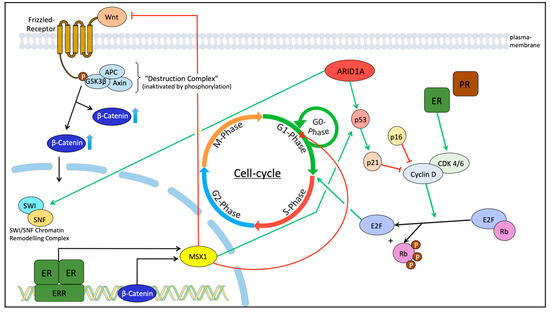 The function of MSX1 in relation to prognostic markers found in our former investigation and investigations from other groups [32,33,34] (basic structure of the figure based on Katarzyna et al. [26]): MSX1 is a known inhibitor of the Wnt-signaling [25] and the result of the Wnt-signaling is the shuttling of β-Catenin from the cytoplasm to the nucleus [37]. Based on this figure, we found a positive correlation of MSX1 and β-Catenin in the cytoplasm. (Destruction-Complex (DC): inactivated by Wnt via Frizzled-receptor (can be inactivated in tumor cells). β-Catenin: accumulates, when DC is inactivated (leads to transcription of target genes (MSX1). SWI/SNF-Chromatin-Remodeling-Complex: acts as tumor suppressor; needs ARID1A. ER: Estrogen receptor; PR: Progesterone receptor; E2F: E2-transcriptional factor; Rb: Retinoblastoma). Green arrows describe a stimulating effect, red arrows describe an inhibitory effect.