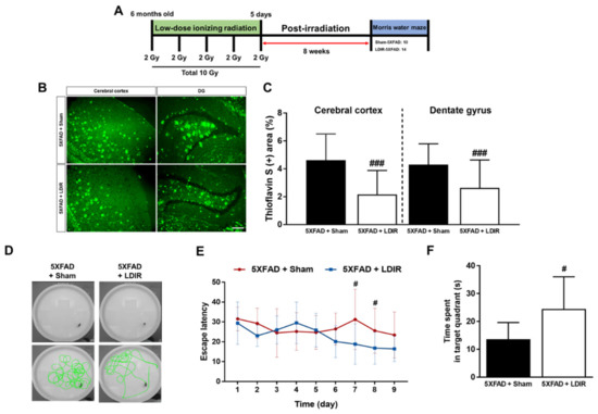 The inhibitory effects of low-dose ionizing radiation (LDIR) therapy on amyloid-β (Aβ) accumulation and cognitive dysfunction in 5XFAD mice. (A) Schematic diagram of the experimental procedure. (B) Histochemical staining for thioflavin S was performed to identify amyloid plaques in the cerebral cortex and hippocampal dentate gyrus (DG) of the sham- and LDIR-treated 5XFAD mice (scale bar = 250 μm). (C) Aβ-positive areas in the cerebral cortex and dentate gyrus of the sham- and LDIR-treated 5XFAD mice were quantified and plotted as a percentage. (D) Representative of swimming paths was recorded on videotape during the test session of the Morris water maze. (E) Latency to escape time of the mice was measured. Repeated-measures two-way ANOVA with Fisher’s post hoc test compared to 5XFAD+Sham mice. (F) Measurement of quadrant time to spend in the hidden platform. Data are presented as mean ± SD (n = 10 mice in sham-treated 5XFAD mice and n = 14 mice in LDIR-treated 5XFAD mice). # p < 0.05 and ### p < 0.001 indicate significant differences between the sham- and LDIR-exposed 5XFAD mice.