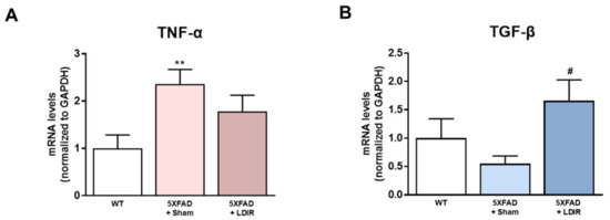 The modulatory effects of LDIR on production of M1/M2 cytokines in the brain of 5XFAD mice. (A) Level of TNF-α mRNA was checked by qRT-PCR. (B) Level of TGF-β mRNA was measured by qRT-PCR. ** p < 0.01 indicate significant differences between the wild-type (WT) and sham-treated 5XFAD mice. # p < 0.05 indicate significant differences between the sham- and LDIR-treated 5XFAD mice. Data are presented as mean ± SD (n = 3 mice each group).