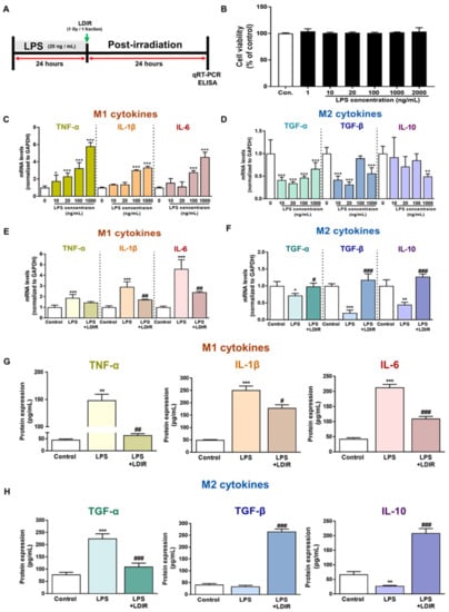 The modulatory effects of LDIR on production and secretion of M1 cytokines (TNF-α, IL-1β and IL-6) and M2 cytokines (TGF-α, TGF-β and IL-10) in lipopolysaccharide (LPS)-treated BV-2 cells. (A) Outline of the experimental design for in vitro assessment. (B) BV-2 cells were treated with LPS at doses of 1, 10, 20, 100, 1000 and 2000 ng/mL for 24 h. Cell viability was determined by the cell counting Kit-8 assay. (C,D) After BV-2 cells were treated with LPS (10, 20, 100, and 1000 ng/mL) for 24 h, the mRNA expression levels of M1 cytokines and M2 cytokines were measured by qRT-PCR. (E–H) BV-2 cells were treated with LPS (20 ng/mL) for 24 h, then exposed to LDIR (1 Gy/ 1 fraction). The mRNA expression levels of (E) M1 cytokines and (F) M2 cytokines were measured by qRT-PCR. The protein levels of (G) M1 cytokines and (H) M2 cytokines in cultured media were measured by ELISA. * p < 0.05, ** p < 0.01, and *** p < 0.001 indicate significant differences between the control and LPS-treated group. # p < 0.05, ## p < 0.01, and ### p < 0.001 indicate significant differences between the LPS- and LPS + LDIR- treated group. Data are presented as mean ± SD from triplicate experiments.