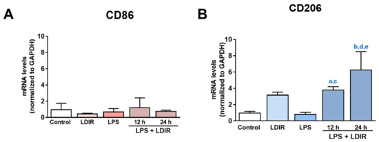 Using the markers for M1 and M2 microglial phenotype [53,54,55], we tried to clearly demonstrate that LDIR can change the polarization of M1/M2 activation of LPS-treated microglial cells. We examined the expression of BV-2 cell surface receptors: M1 phenotypic marker CD86 and M2 phenotypic marker CD206. At the mRNA levels, the LPS or LDIR alone did not induce the inflammatory response on BV-2 cells compared with control group. In addition, there were no changes of CD86 in the LPS-treated BV-2 cells 12 and 24 h after LDIR exposure (Figure 4A). On the other hand, there were significant up-regulation of CD206 in the LPS-stimulated BV-2 cells 12 and 24 h after LDIR exposure (Figure 4B). We demonstrated that M2 polarization of microglia can be induced by LPS+LDIR treatment.