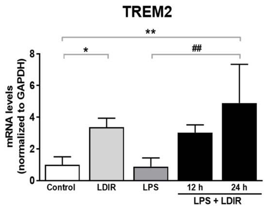 TREM2, one of microglial transmembrane receptors, is known as a regulator of the microglial M1/M2 polarization and microglial responsivity in AD [22,30]. We examined whether the LDIR may affect the expression of TREM2 in microglia showing polarization to M2 phenotype. We found the LDIR-mediated up-regulation of TREM2 mRNA level in BV-2 cells, compared with control groups. Furthermore, LPS-treated BV-2 cells exposed to LDIR showed significant up-regulation of TREM2 mRNA in BV-2 cells, compared with LPS-treated groups (Figure 5). Taken together, our data suggest that LDIR treatment could simultaneously induce M2 polarization of microglia and the upregulation of TREM2 in activated microglia.