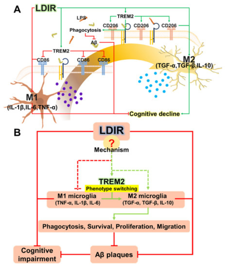 Recently, studies about LDIR exposure for the treatment of AD have been increasing [38,39]. Although previous studies have reported the beneficial effect of the LDIR therapy on the Aβ pathology and cognitive decline in AD [43,45], there has been few studies about the mechanism of the LDIR therapy for the treatment of AD. Therefore, we examined the effects of the LDIR on microglial phenotypes and expression of TREM2 in AD models. Consistent with previous reports, our results also revealed that LDIR inhibits Aβ deposition and cognitive dysfunction in 5XFAD mice (Figure 1). Intriguingly, exposure to LDIR regulated the expression of pro-inflammatory and anti-inflammatory cytokines in the brain of Aβ-overexpressing transgenic mice (Figure 2). Next, we examined the direct effect of LDIR on the changes of M1/M2 cytokines in cultured microglial BV-2 cells. Surprisingly, the mRNA and protein levels of M1 proinflammatory cytokines, such as TNF-α, IL-1β, and IL-6, were significantly reduced and the mRNA and protein levels of M2 anti-inflammatory cytokines, such as TGF-α, TGF-β, and IL-10, were significantly increased in the LPS-treated microglia after the exposure of LDIR when compared to LPS-stimulated cells (Figure 3). Moreover, the LDIR treatment significantly increased expression of M2 phenotypic marker CD206 in LPS-treated microglia (Figure 4), suggesting that the interaction between LPS and LDIR therapy can switch the microglial phenotype from M1 to M2. Additionally, expression of TREM2 involved in microglial M1/M2 polarization was increased after the LDIR exposure in LPS-stimulated microglia (Figure 5). Taken together, it has been suggested that the LDIR treatment inhibits the cognitive deficit and Aβ deposition in AD by modulating the polarization of microglial phenotype and expression of TREM2 (Figure 6A).