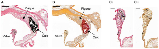 Conventional 2-D histology combined with light microscopy allows specific tissue and cellular components to be identified and is, therefore, used to classify a wide range of tissue conditions and disease states. Formalin-fixed, paraffin-embedded tissues are routinely prepared for 2-D histopathologic investigations; with the von Kossa or alizarin red S stains being used to detect calcifications in these specimens [17,26,27,28,29,41,46,63]. Calcified tissue stains black for phosphate with von Kossa (Figure 1A) [64], and red for calcium with alizarin red S (Figure 1B) [65]. However, in mouse aortic valves, von Kossa can give a false positive stain due to the presence of melanocytes [6] (Figure 1(C)/(i)) which can also appear black in sections stained with alizarin red S (Figure 1(C)/(ii)) [66]. Therefore, it is advisable that both von Kossa and alizarin red S stains are used to confirm calcification in the aortic valves [67,68]. Alternatively, hematoxylin and eosin (H&E) staining could be used to identify melanocytes.