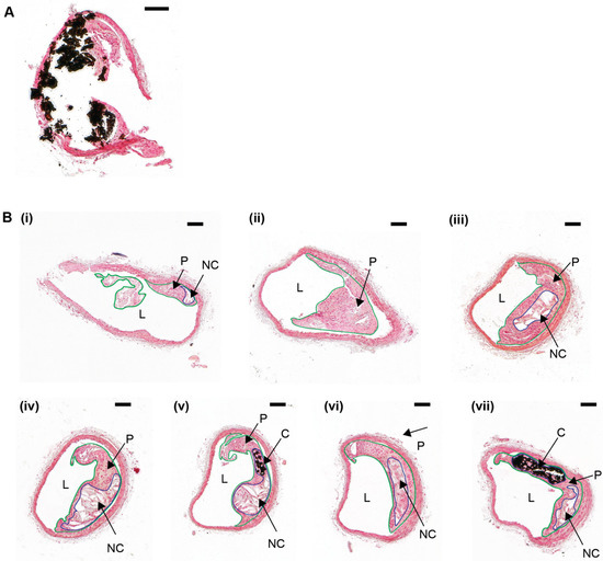 Atherosclerotic plaque calcification heterogeneity in a serially-sectioned brachiocephalic artery from an ApoE−/− mouse. (A) Formalin-fixed brachiocephalic artery tissue section from a 10-week old ApoE−/− mouse fed a high fat, high cholesterol diet for 28 weeks. The tissue was taken through a series of graded alcohols and rehydrated, stained with von Kossa, and then counterstained with nuclear fast red. A large calcification (stained black) has “dropped out” during sectioning, resulting in shearing artefacts and tissue damage. (B) A formalin-fixed brachiocephalic artery from a 10-week old ApoE−/− mouse fed a high fat, high cholesterol diet for 28 weeks was serially sectioned, collecting a total of 120 sections, with each section—10 µm in size. Tissue sections were collected from the brachiocephalic artery bifurcation (B)/(i) into the main brachiocephalic artery trunk (B)/(ii–vii), and sections every 200 µm intervals were stained with von Kossa and counterstained with nuclear fast red. The atherosclerotic plaque is outlined in green. The necrotic core, which is an internal lipid-rich region lacking in collagen or cell nuclei but contains cell debris, is outlined in blue. Both atherosclerotic plaque and calcification heterogeneity are noted throughout the brachiocephalic artery. Lumen (‘L’); Plaque (‘P’); Necrotic core (‘NC’); Calcification (‘C’). Scale bar = 100 µm.