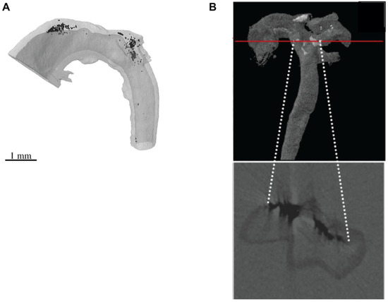 µCT imaging of calcified mouse blood vessels. (A) A formalin-fixed, corn oil immersed aortae from the Enpp1−/− mouse model of arterial medial calcification was scanned by µCT using a voxel size of 10 µm, and the images reconstructed to form a 3-D imaged volume. X-ray dense calcifications (black) localized to the upper curvature of the ascending aorta and aortic arch. (B) A formalin-fixed, paraffin-wax embedded aorta from the LDLR−/− mouse model of atherosclerosis and arterial intimal calcification was scanned by µCT using a voxel size of 5.63 µm, and the images reconstructed to form a 3-D imaged volume. X-ray dense calcifications (black) are observed in a phase virtual slice from the 3-D imaged volume (indicated by the red line). (A) Reproduced from Reference [73] with permission. (B) Reproduced from Reference [95] with permission.