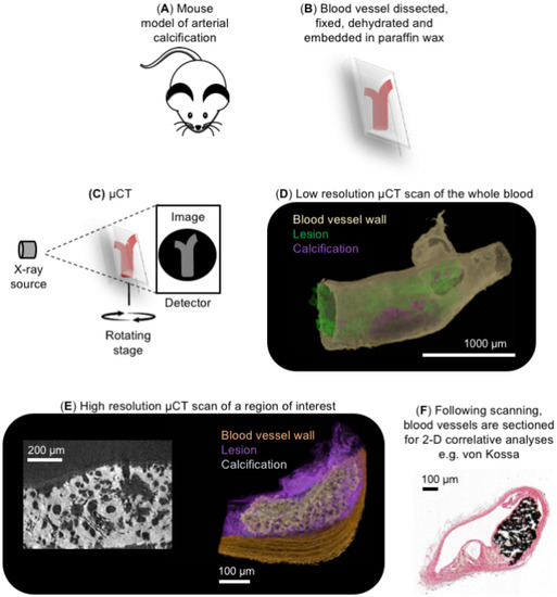 To overcome the poor resolution capabilities for vascular calcification studies, previously described multi-scale scanning µCT approaches [70,87] have been used to visualize and quantify calcified deposits in blood vessels to achieve isotropic voxel sizes down to 0.5 µm (Figure 4A–E). To do this, dissected blood vessels that have been formalin-fixed, dehydrated, and embedded in paraffin wax using standard histological approaches (Figure 4A,B) [70,91] are scanned using a laboratory µCT system (Figure 4C) [95,96]. A faster, lower resolution µCT scan of the whole blood vessel is performed initially to visualize the localization and distribution of calcified deposits in 3-D (Figure 4D), which can then be quantified [95,96]. Regions of interest are then subsequently imaged at higher resolutions to examine the finer structure of the calcified deposits and the blood vessel ECM (Figure 4E) [70]. By taking advantage of higher objectives, these higher resolution scans can be performed using laboratory µCT sources to achieve a spatial resolution down to 0.5 µm (Figure 4E) [70]. Alternatively, sub-micron (e.g., 150 nm) resolutions could be achieved with laboratory nano-CT (nCT) sources, which has previously enabled the visualization of the medial interlamellar regions in rat carotid arteries [70]. Paraffin wax-embedded blood vessels can be subsequently mechanically sectioned for correlative histological, immunohistochemical, and laser capture microdissection techniques for nucleic acid or proteomic analyses (Figure 4F) [70,95,96].