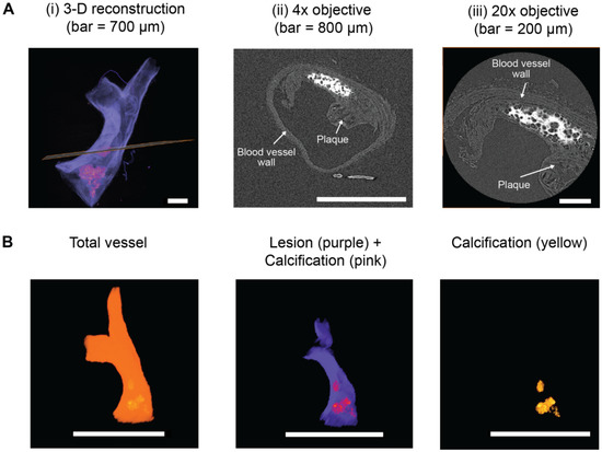 As discussed in the Introduction, the structure and composition of an atheromatous plaque and, specifically, the size and distribution of intimal calcifications within the plaque are important risk factors for rupture and subsequent cardiovascular events [7,8,9,10,123]. Using 2-D histological approaches to analyze intimal calcification in pre-clinical animal studies has been associated with several drawbacks, including shearing artefacts and the inability to examine spatial heterogeneity in calcification throughout an intact blood vessel. Non-destructive µCT can overcome these limitations, enabling the 3-D visualization and quantification of lipids, calcification, adipose tissue, and the blood vessel wall in chemically-fixed, paraffin wax-embedded atherosclerotic human carotid [124,125], and coronary arteries [74,76,88,92,126] ex vivo. Importantly, µCT has also enabled the detection of microcalcifications in intact human blood vessels, which are associated with an increased risk of plaque rupture [74]. These microcalcifications are likely to go undetected using 2-D histological approaches unless serial tissue sections are cut, stained, imaged, and analyzed from a single blood vessel.