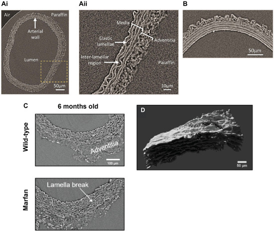 Visualization of elastic fiber remodeling in blood vessels. (A)/(i) Phase virtual slices from laboratory-based µCT of an intact rat common carotid artery at a 4x objective (voxel size 0.75 µm). The yellow box indicates the magnified region shown in (A)/(ii). (B) The resolutions achieved with laboratory-based µCT can be improved using a 20× objective (voxel size 0.5 µm). (C) Representative phase virtual slices from synchrotron-based µCT of intact aortas from 6 months old wild-type and Marfan syndrome mice. (D) 3-D volumetric rendering of a laterally-viewed aortic wall from a Marfan syndrome mouse; here, only lamellae of the tunica media layer are rendered. (A)/(i,ii), (B) Images reproduced from Reference [70]. (C,D) Images reproduced from Reference [91].
