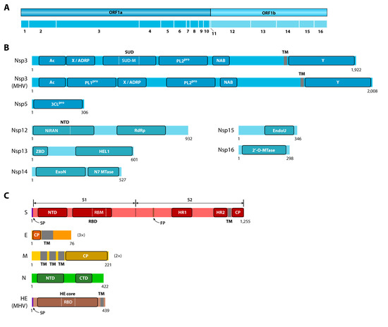 Main functional domains in protein-coding genes. (A) Location of Nsps along the sequence of ORF1a and ORF1b. (B) Functional domains of Nsp3, Nsp5, Nsp12, Nsp13, Nsp14, Nsp15 and Nsp16. (C) Functional domains of structural proteins. All proteins are from SARS-CoV, except for the Nsp3 and HE proteins of murine hepatitis virus (MHV), which are included for comparative purposes. Proteins are drawn to scale, except for E and M, which are drawn three (3×) and two (2×) times larger, respectively. Specific domain name abbreviations are explained in the main text. TM: transmembrane domain, SP: signal peptide, FP: fusion peptide, RBD: receptor-binding domain, CP: cytoplasmic domain, NTD: N-terminal domain, CTD: C-terminal domain.