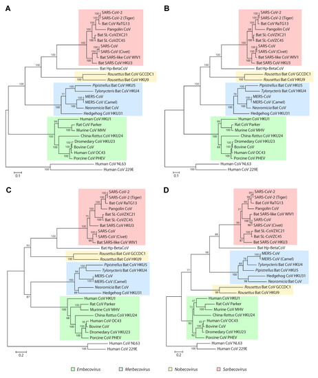 For the taxonomic classification of coronaviruses, the ICTV currently recommends the use of domains 3CLpro, NiRAN, RdRp, ZBD and HEL1 of Nsp3, Nsp12 and Nsp13 [52]. These domains are conserved in all viruses of the order Nidovirales and can therefore be used for deeper phylogenetic analyses [53]. Recent studies exploring the phylogenetic position of SARS-CoV-2 have shown that trees built using some of these conserved domains are consistent with those based on whole genome sequences, at least at the genus and subgenus levels [4,52,54,55] (Figure 4A,B). However, in studies exploring shallower phylogenetic relationships, such as those focused on closely related viral strains isolated from different hosts, conserved domains may not have enough variability to ensure robust separation of some taxa. This is evidenced by the relatively low branch support estimates occasionally obtained for some subclades from the same subgenus in trees based on conserved domains, when compared to whole genome trees [4,52] (Figure 4B,D). More variable segments or complete genome sequences may be a better choice in these scenarios, to build more robust phylogenetic trees.