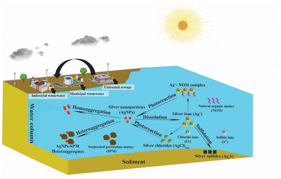 The understanding of ENMs’ environmental behaviors is fundamentally important in establishing fate models for ENMs in the environment. In this section, we review the state of the art in the studies of ENM fate processes in the aquatic environment. Possible fate processes of ENMs are usually first investigated in laboratory experiments using simulated environmental conditions to evaluate their potential to occur in natural systems. The current literature suggests that ENMs, depending on specific types, can undergo physical transformation processes, including aggregation (homoaggregation and heteroaggregation), as well as chemical transformation processes, including dissolution, sulphidation, and photoreactions [31,37,72,73]. Figure 1 shows the environmental fate processes of ENMs in surface waters. Here, AgNPs are used as an example to illustrate the ENM fate processes because AgNPs have a wide variety of fate processes that are also common to other ENMs, such as aggregation (homoaggregation and heteroaggregation), dissolution, and sulphidation, and/or specific to themselves, such as photoreactions. These ENM fate processes are discussed as follows.