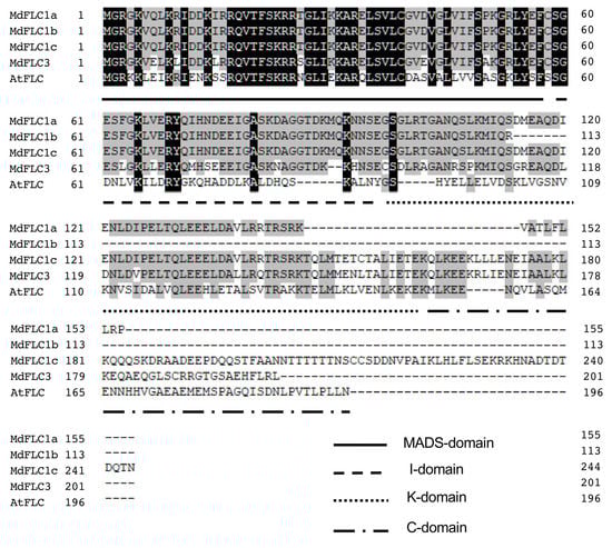 Amino acid sequence alignment of MdFLC and AtFLC. The MADS-, K-, I-, and C-domains are underlined. Identical amino acids for five and less proteins are shown in black and gray boxes, respectively.