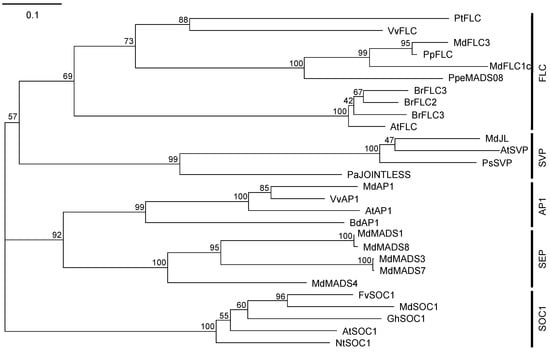A phylogenetic tree based on the amino acid sequences of FLC, SVP, AP1, SEP, and SOC1 homologs from various species. The tree was constructed by the neighbor-joining method after sequence alignment using the ClustalW program. Branch numbers refer to percentage of replicates that support the branch using the bootstrap method (1000 replicates). The scale bar corresponds to 0.1 amino acid substitutions per residue. The accession numbers of the proteins added to construct the phylogenetic tree are as follows: PtFLC (EU497676), VvFLC (GU133630), PpFLC (KP164015), BrFLC1 (DQ866874), BrFLC2, (DQ866875), BrFLC3 (DQ866876), MdJOINTLESS (DQ402055), AtSVP (AF211171), PsSVP (AY830919), PaJOINTLESS (EU332978), VvAP1 (GU133634), MdAP1 (EU672877), AtAP1 (BT004113), BdAP1 (HQ588324), MdMADS1 (U78947), MdMADS3 (U78949), MdMADS4 (U78950), MdMADS7 (AJ000760), MdMADS8 (AJ001681), FvSOC1 (FJ531999), MdSOC1 (DQ846833), GhSOC1 (JF701982), NtSOC1 (JQ686938), AtSOC1 (AY093967).