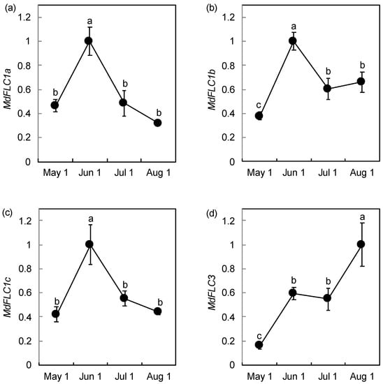 Seasonal changes in the expression levels of MdFLC1a (a), MdFLC1b (b), MdFLC1c (c), and MdFLC3 (d) in the leaves of adult trees. Total RNA was prepared for the expression analysis of MdFLC1 and MdFLC3 on May 1, June 1, July 1, and August 1, 2016. Relative expression was determined using triplicate measurements taken from three independent biological replicates. The relative expression levels were normalized against MdACTIN with standard errors, and the maximum level of the transcripts was set at 1.0. The values with different letters for each gene significantly differed between days at p < 0.05, according to a Tukey test.