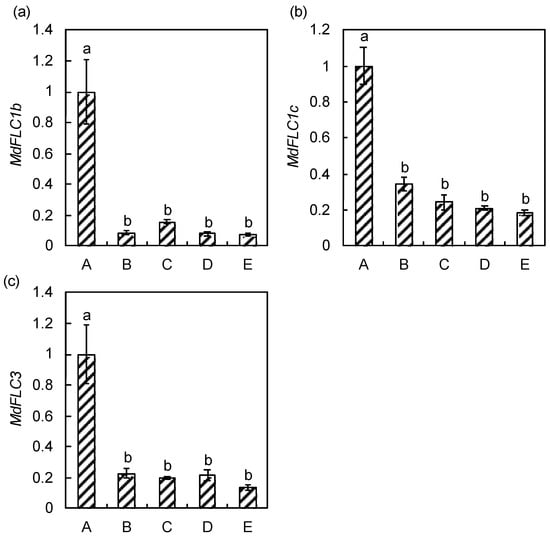 Three cDNA sequences of MdFLC1 were searched in the GDR database, and MdFLC1 was found to correspond to MD05G1037100. MdFLC1c mRNA contained all exons, whereas MdFLC1a and MdFLC1b mRNA contained the sequences of the fourth and third introns, which were not removed in splicing, respectively (Figure 6). Therefore, the deduced amino acid sequence of MdFLC1c contained MADS-, I-, K-, and C-domains, whereas the sequences of MdFLC1a and MdFLC1b lacked K- and C- domains because of the stop codons in the intron sequences of their mRNA (Figure 1). K- and C-domains are important for protein–protein interactions and other functions in MIKC-type MADS proteins [34]. These results suggest that MdFLC1c plays the role of MdFLC1 and that MdFLC1a and MdFLC1b are expected to be non-functional. However, since the regulation of expression by selective splicing has been reported in plant response to environmental stress [35], expression analysis was performed in the three splicing variants of MdFLC1. The MdFLC3 cDNA sequence was consistent with that of MD10G1041100 in the GDR database, and its deduced amino acid sequence contained the four domains of an MIKC-type MADS protein (Figure 1), suggesting that MdFLC3 functions as an MIKC-type MADS protein.