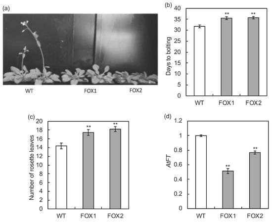 Delays in bolting were observed in more than three transgenic plants from individual seeds (T1) obtained by Agrobacterium in planta vacuum infiltration transformation. Detailed analysis was performed on their progenies, lines FOX1 and FOX2. The growth of FOX1 and FOX2 lines was observed and expression analysis of AtFT was then performed (Figure 5; Figure S1a,b, Supplementary Materials). The number of days from sowing to bolting was 31.8 in the wild-type (WT) control, and that in FOX1 and FOX2 was 35.5 and 35.7 days, respectively. The number of rosette leaves at the time of bolting was 14.4 in the wild-type and 17.5 and 18.2 in FOX1 and FOX2, respectively. A lower expression level of AtFT was observed with late flowering in the FOX lines. A very high expression level of MdFLC3 was confirmed in the FOX lines, whereas only a trace expression of endogenous FLC (AtFLC) was found in the FOX lines and wild-type (Figure S2, Supplementary Materials). The average value of transformants derived from individual seeds, which are different from FOX1 and FOX1 lines, at the beginning of transformation showed delayed bolting, supporting the above result (Figure S1c,d).