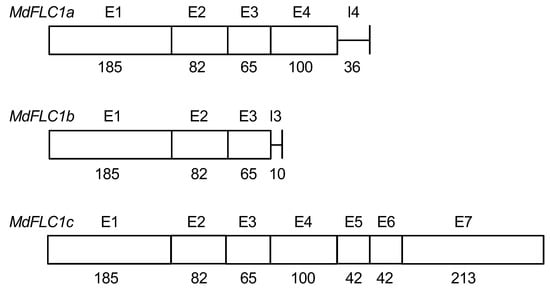 Transcript structures of MdFLC1 splice variants, MdFLC1a, MdFLC1b, and MdFLC1c. E and I with numbers indicate exons and introns, respectively. Numbers under the bar correspond to their sizes, in base pairs.
