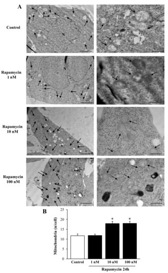 Rapamycin dose-dependently increases mitochondrial number in U87MG cell line. (A) Representative TEM micrographs showing mitochondria (indicated by black arrows) from Control and from different doses of rapamycin. (B) Graph reports the number of mitochondria per cell. Values are the mean ± S.E.M. from 50 cells per group. ∗ p ≤ 0.05 vs. Control and 1 nM rapamycin; Scale bars = 1 μm (low magnification) and 0.56 μm (high magnification).