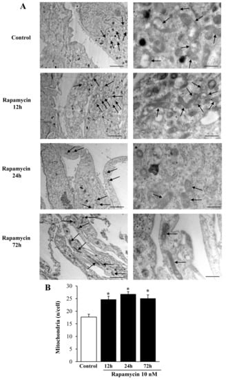 2.3. Rapamycin Modifies Mitochondrial Number, Size, and Phenotype