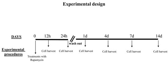 Overview of the experimental design. Rapamycin was administered continuously for 12 h or 24 h to the cell cultures; then, it was withdrawn for 24 h up to 14 d. Thus, the first time interval of rapamycin withdrawal (24 h) is indicated as 1 d and it corresponds to rapamycin administration for 24 h followed by 24 h of withdrawal. All later time intervals are reported considering the days the rapamycin withdrawal time lasted.