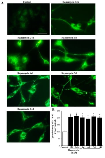 2.2. Rapamycin Produces a Two-Fold Increase in MitoTracker-Green (MTR-G)