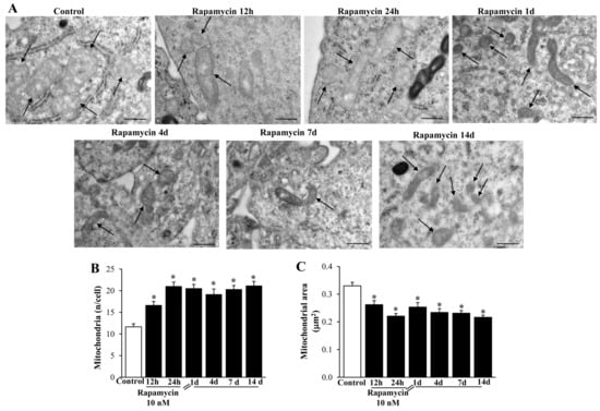Rapamycin modifies mitochondrial number, area, and phenotype within U87MG cells. (A) Representative TEM micrographs showing mitochondria (indicated by black arrows) at different time intervals (from 1 d up to 14 d) following 10 nM rapamycin. The graph (B) reports the number of mitochondria, which steadily increased at each time interval following rapamycin administration. Graph (C) measures the mitochondrial area, which steadily decreased following rapamycin. This indicates that rapamycin produces an augmentation in the number of mitochondria, which feature a much smaller size. Values are the mean ±S.E.M. from 50 cells per group, while mitochondrial area was calculated from 100 mitochondria per group. * p ≤ 0.05 vs. Control. Scale bar = 0.56 μm.