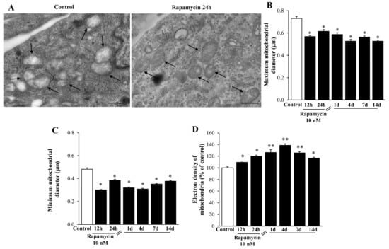 Rapamycin re-shapes mitochondria within U87MG cells at different time intervals. (A) Representative TEM micrographs showing mitochondria (arrows) from Control and following 10 nM rapamycin at 24 h. Graphs (B,C,D) confirm that reported in Figure 7 after rapamycin withdrawal from 1 d up 14 d. In fact, both the maximum (B) and minimum (C) mitochondrial diameter were decreased, whereas the mitochondrial electron density (D), which is expressed as a percentage of mitochondrial electron-density measured from Control, was increased. Values were obtained from 100 or 250 mitochondria per group. * p ≤ 0.05 vs. Control; ** p ≤ 0 05 vs. Control and 12 h. Scale bar = 0.56 μm.