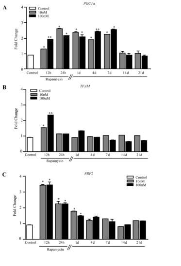 Rapamycin increases mitochondriogenesis-related genes within U87MG cells. RT-PCR for (A) PGC1α, (B) TFAM, and (C) NRF2. * p ≤ 0.05 vs. Control; ** p ≤ 0.05 vs. Control and 10 nM rapamycin. Each RT-PCR was performed in triplicate and confirmed in two independent experiments using both beta-globin and beta-actin as internal references.