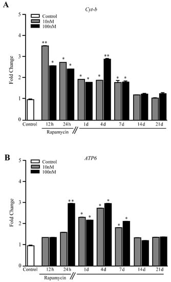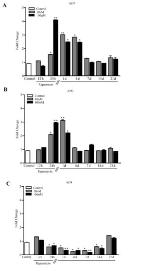 Although constitutive mitochondrial genes ND1 and ND2 were increased following rapamycin administration, the effects of rapamycin on ND4 levels were confused. In fact, apart from a slight increase at 12 h, a persistent significant decrease in ND4 levels was measured up to 14 d. The reason for such a discrepancy was not analyzed in the present experimental work. It may be hypothesized that, since ND4 is placed in a locus where mtDNA is more vulnerable to structural re-arrangements [59,60], this may lead to a loss of integrity upon mtDNA replication (Figure S10).