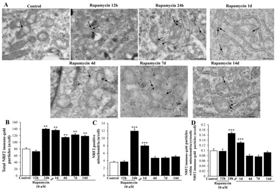 The levels of NRF2 protein within the cytosol and mitochondria were measured through immune-gold staining with TEM. The total amount of NRF2 per cell was markedly increased up to 14 d following rapamycin withdrawal, although at 12 h during rapamycin (when NRF2 mRNA levels were already elevated) the protein levels were similar to Control (Figure 12A,B). The specific placement of NRF2 at mitochondrial level was dramatically increased at 24 h of rapamycin and 1 d following rapamycin withdrawal (Figure 12C). When the ratio of total vs. mitochondrial NRF2 was calculated, the polarization of the protein towards mitochondria was still significant at 24 h and 1 d (Figure 12D). Such a discrepancy for the whole cell increase in NRF2 (long-lasting) and the site-specific increase within mitochondria (transient, at 24 h of rapamycin and 1 d following rapamycin) is presently unknown, although it suggests a more generalized effect on organelle biogenesis going beyond mitochondrial level. This was confirmed also in the A172 cell line (Figure S6).
